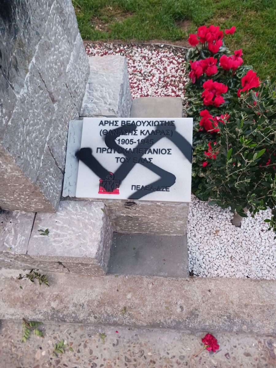 Σαν τα ποντίκια βγήκαν μέσα στην νύχτα από τα λαγούμια τους τα φασιστικά σκουλήκια για να βεβηλώσουν το μνημείο του πρωτοκαπετάνιου του Ελλάς, Άρη Βελουχιώτη, στην Πετρούπολη. Λίγες, μόλις, μέρες πριν την 28η Οκτωβρίου, έβγαλαν όλο τον βόθρο που έχουν μέσα τους με αγκυλωτούς σταυρούς και ναζιστικά σύμβολά. Δεν άντεξαν ούτε μια εβδομάδα να βλέπουν την ηρωική μορφή του Άρη να κοσμεί την Πετρούπολη και το βρομερό τους χέρι βεβήλωσε το μνημείο. Ότι και αν κάνουν όμως, όσο δηλητήριο και αν χύσουν, να το ξέρουν καλά: Ο Άρης θα είναι για τον λαό μας σύμβολο αγώνα, ηρωική μορφή, πηγή έμπνευσης για τους σημερινούς αγώνες.